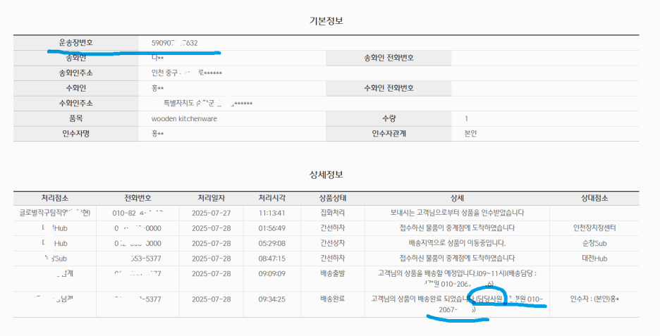 또한 택배사에 인계된 상품의 위치는 운송장 번호를 통해 조회할 수는 있어도 당사자가 아니면 직접 확인이나 문의는 안됩니다.