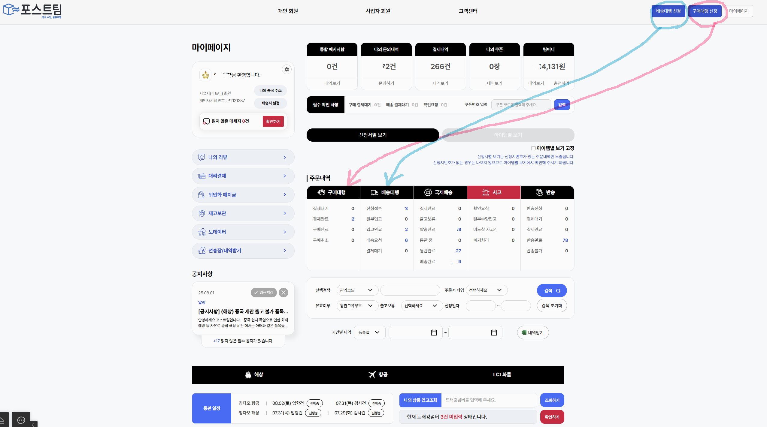 포스트팀에 보면 오른쪽 상단에 구매대행을 이용할지 배송대행을 이용할지 선택할 수 있고 주문 내역에 구매대행과 배송대행의 배송 과정을 확인할 수 있습니다.