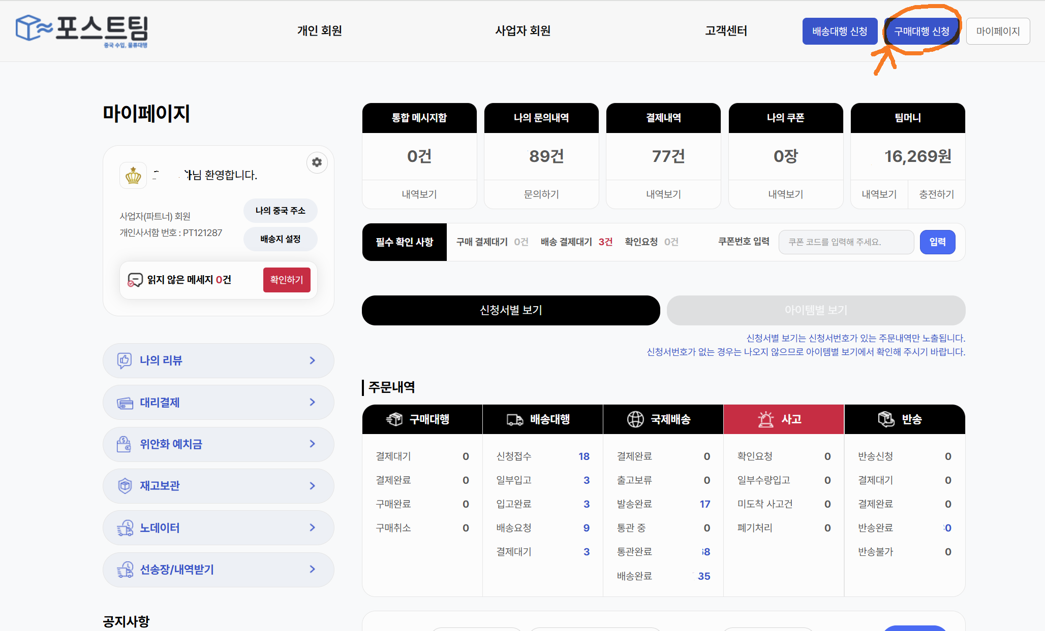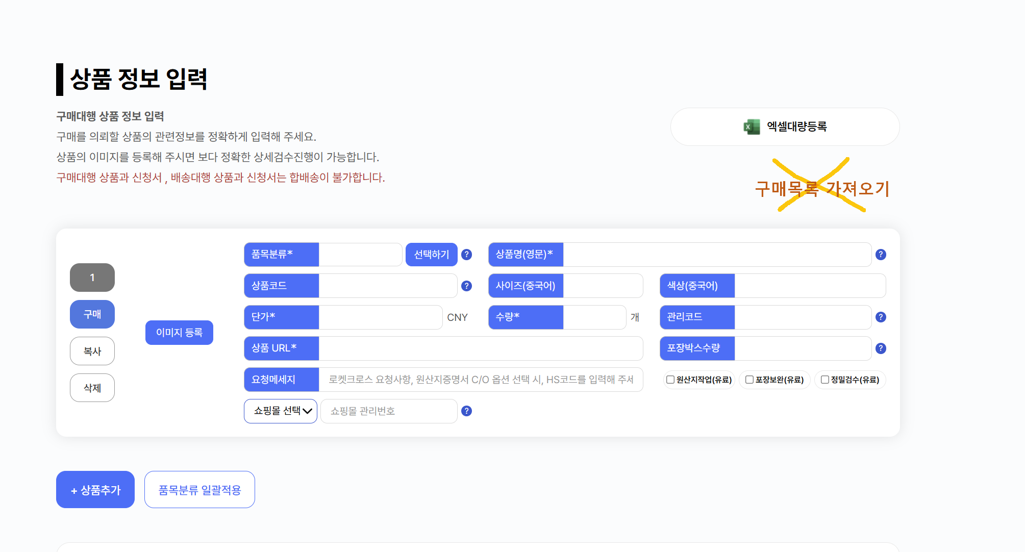 배송대행과 다르게 구매대행은 자동으로 구매 내역이 입력되는 구매목록 가져오기가 없습니다