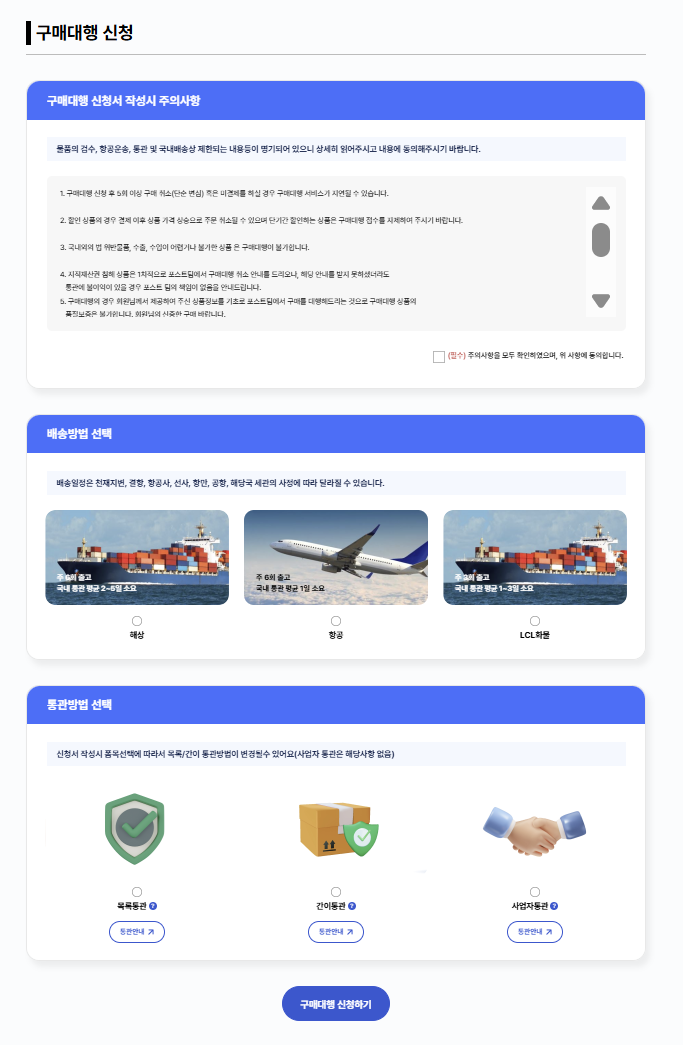✅ 주의사항 클릭 > 배송방법선택 > 통관방법선택 > 배송대행 신청하기