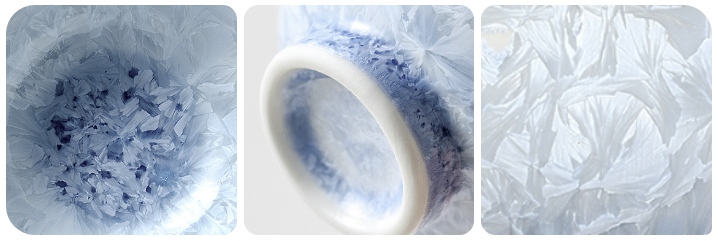 유약이 고온에서 녹았다가 서서히 식으면서 결정(crystal) 이 맺히듯 굳어지는데,